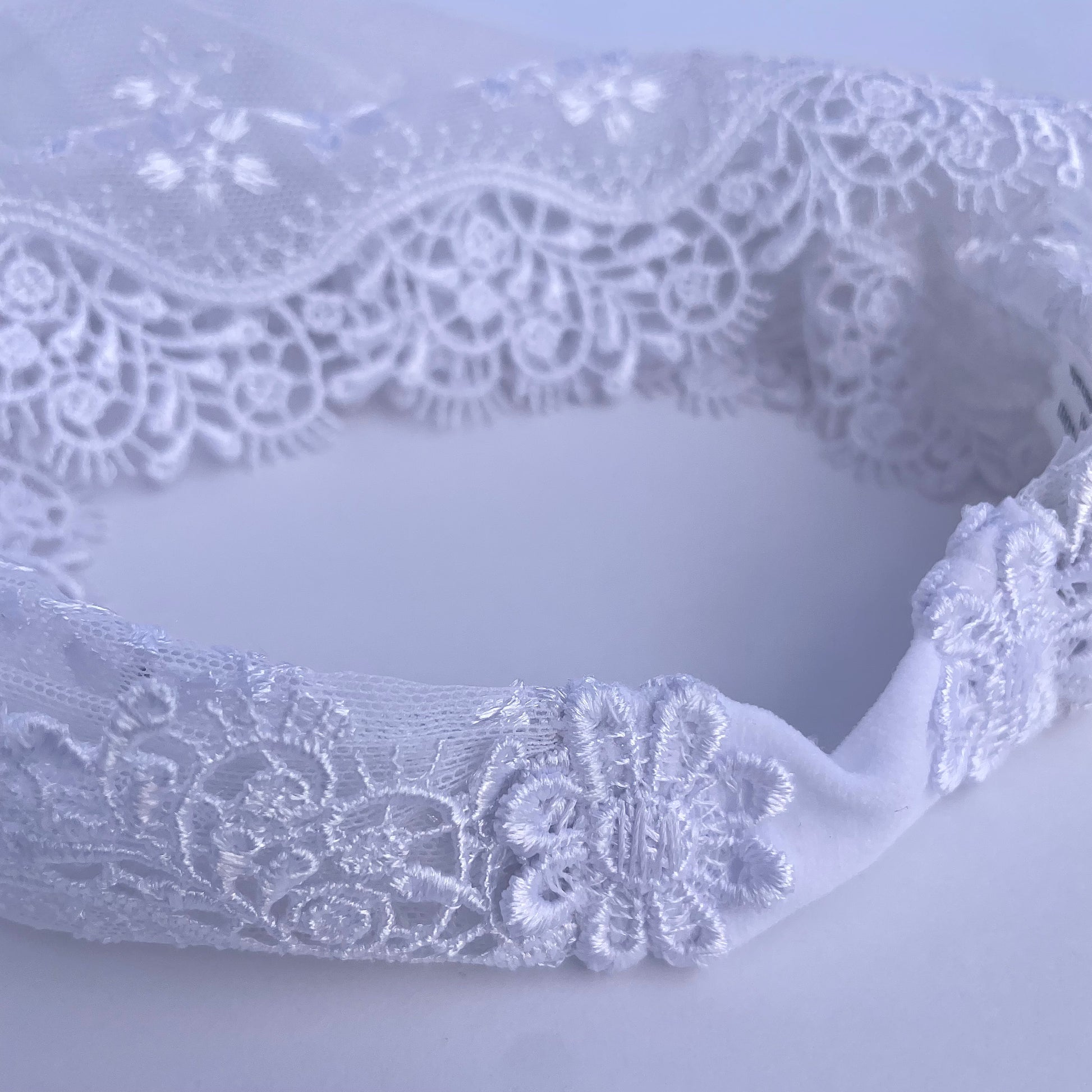 This soft floral ivory lace baby headband veil surrounds your precious one’s head with floral vines embroidery.