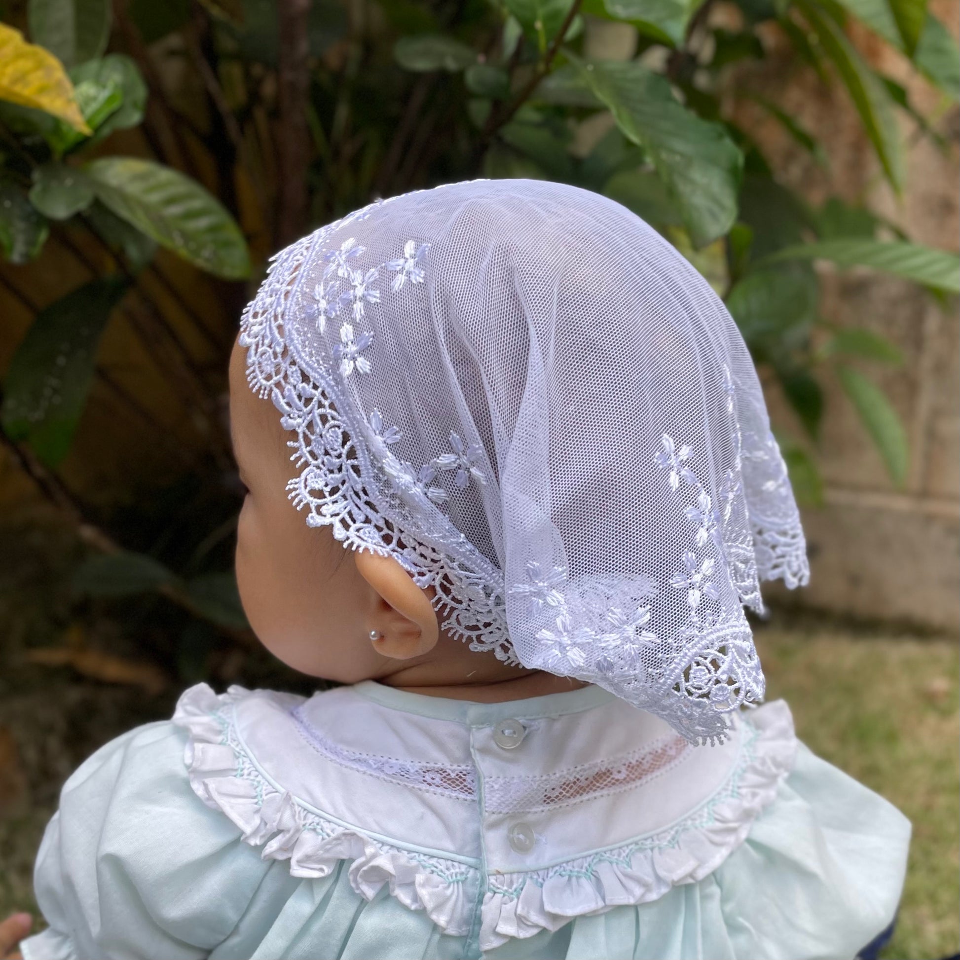The baby veil comes in one of three sizes (Newborn, Infant, or Toddler) and measures about 9” front to back. A soft, stretchy, and seamless nylon is sewn into the back of the headband, offering a comfortable fit as your little one grows. Prior to purchasing a baby’s veil, please measure baby’s head circumference and refer to the sizing chart found under the product photos for the best fit.